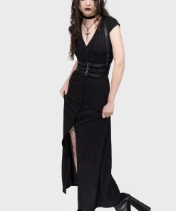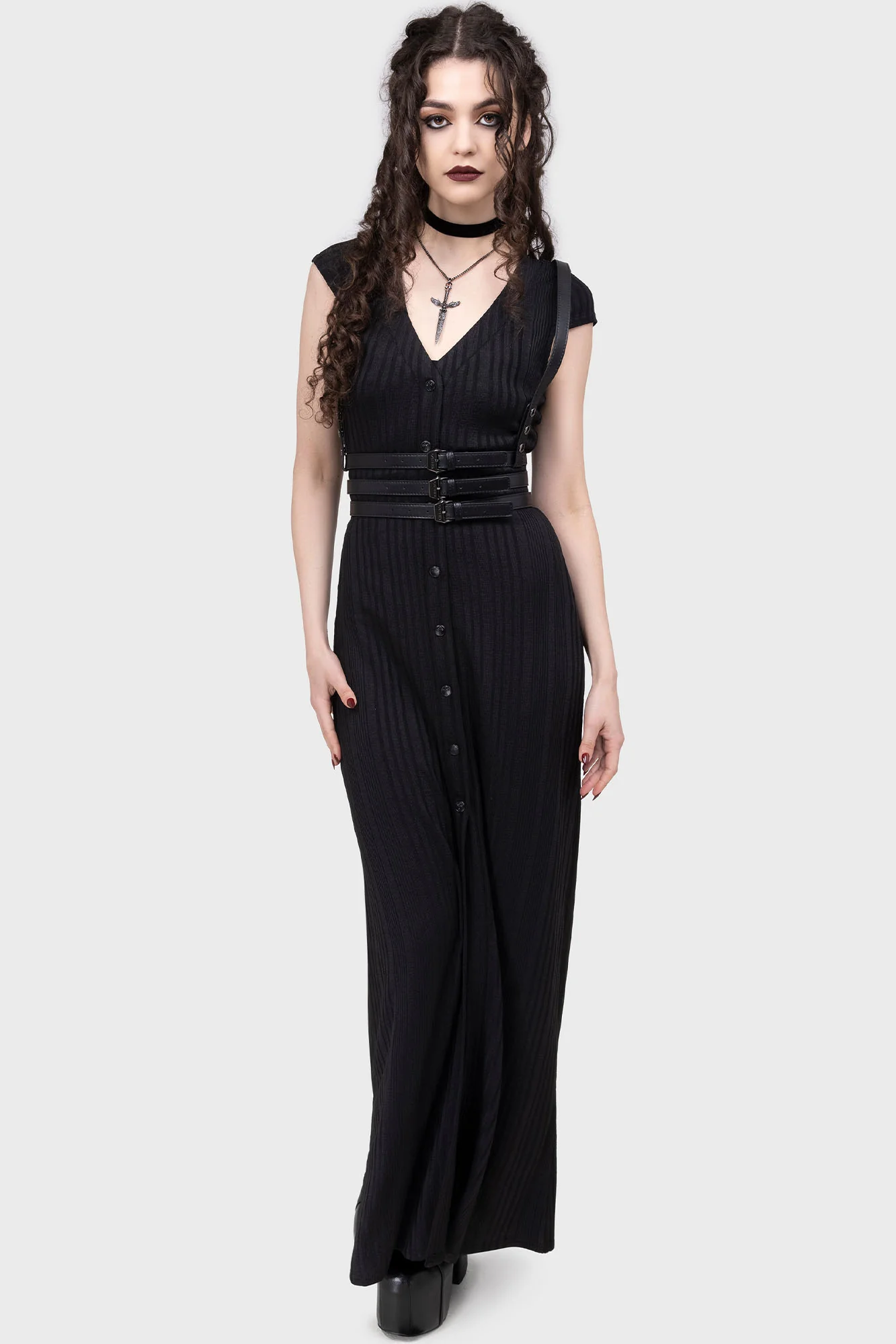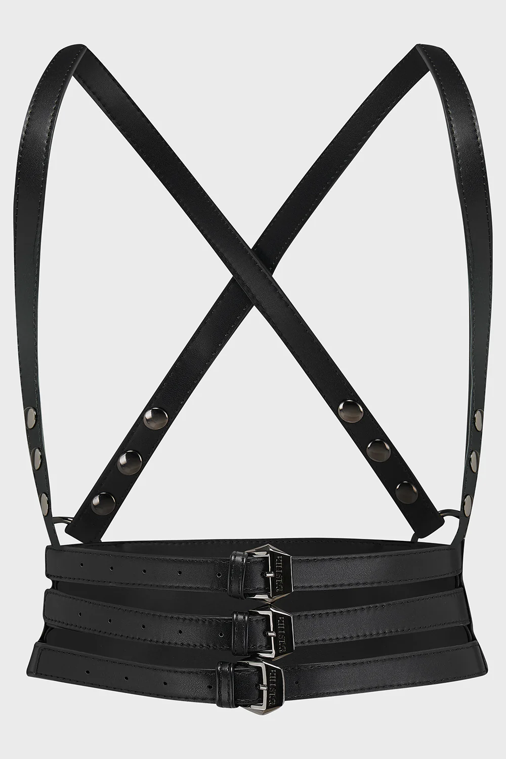 – Three adjustable custom coffin belt buckle straps around the front waist.