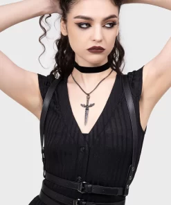 – Three adjustable custom coffin belt buckle straps around the front waist.