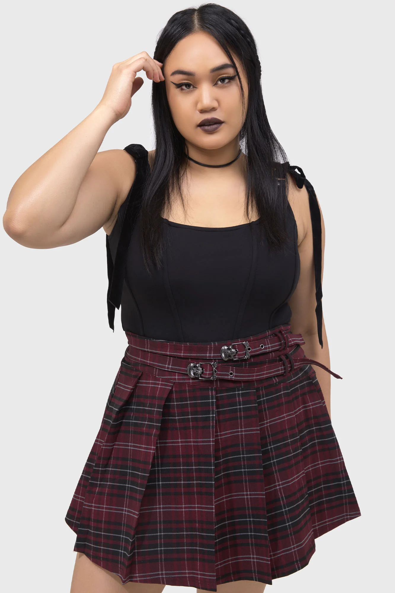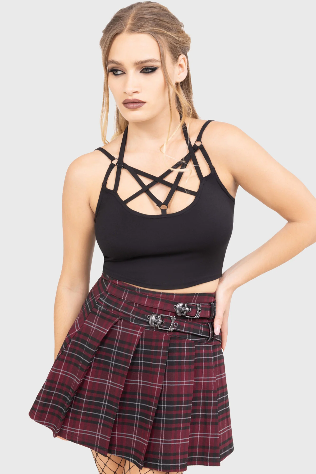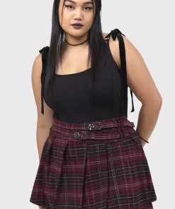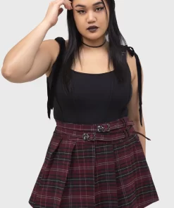 – Pleated mini skirt style.